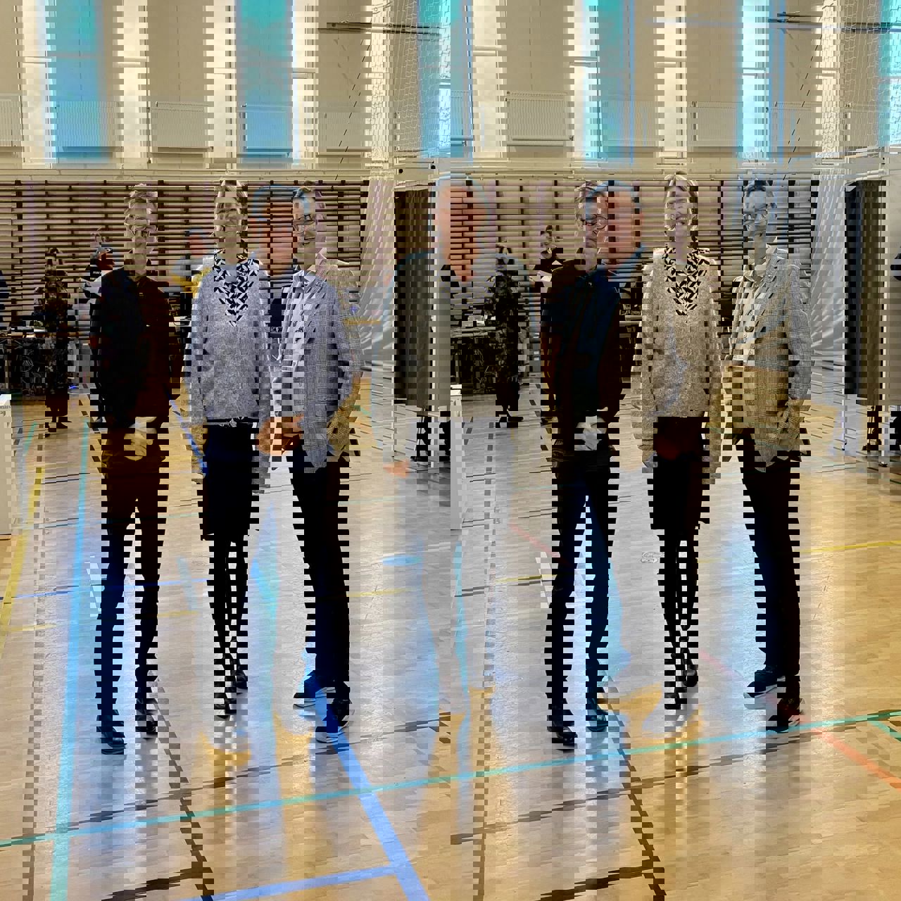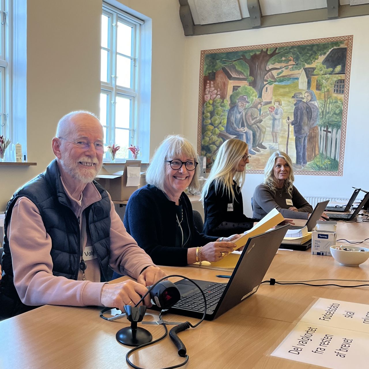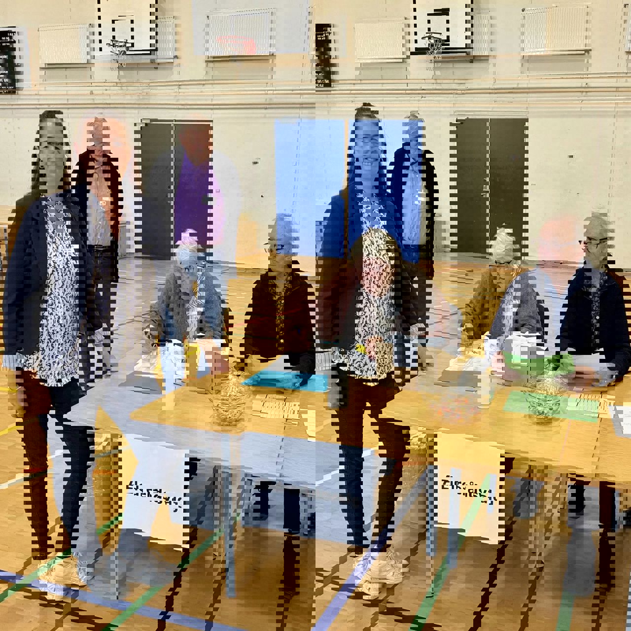 Kort efter kom kommunaldirektør Claus Steen Madsen og borgmester Karina Vincentz også forbi hallen i Herrestrup. Ikke for at stemme, men for at hilse på valgholdet som tager sig af alt det praktiske arbejde med at tage imod og registrere de vælgere, som kommer ind for at sætte deres krydser.