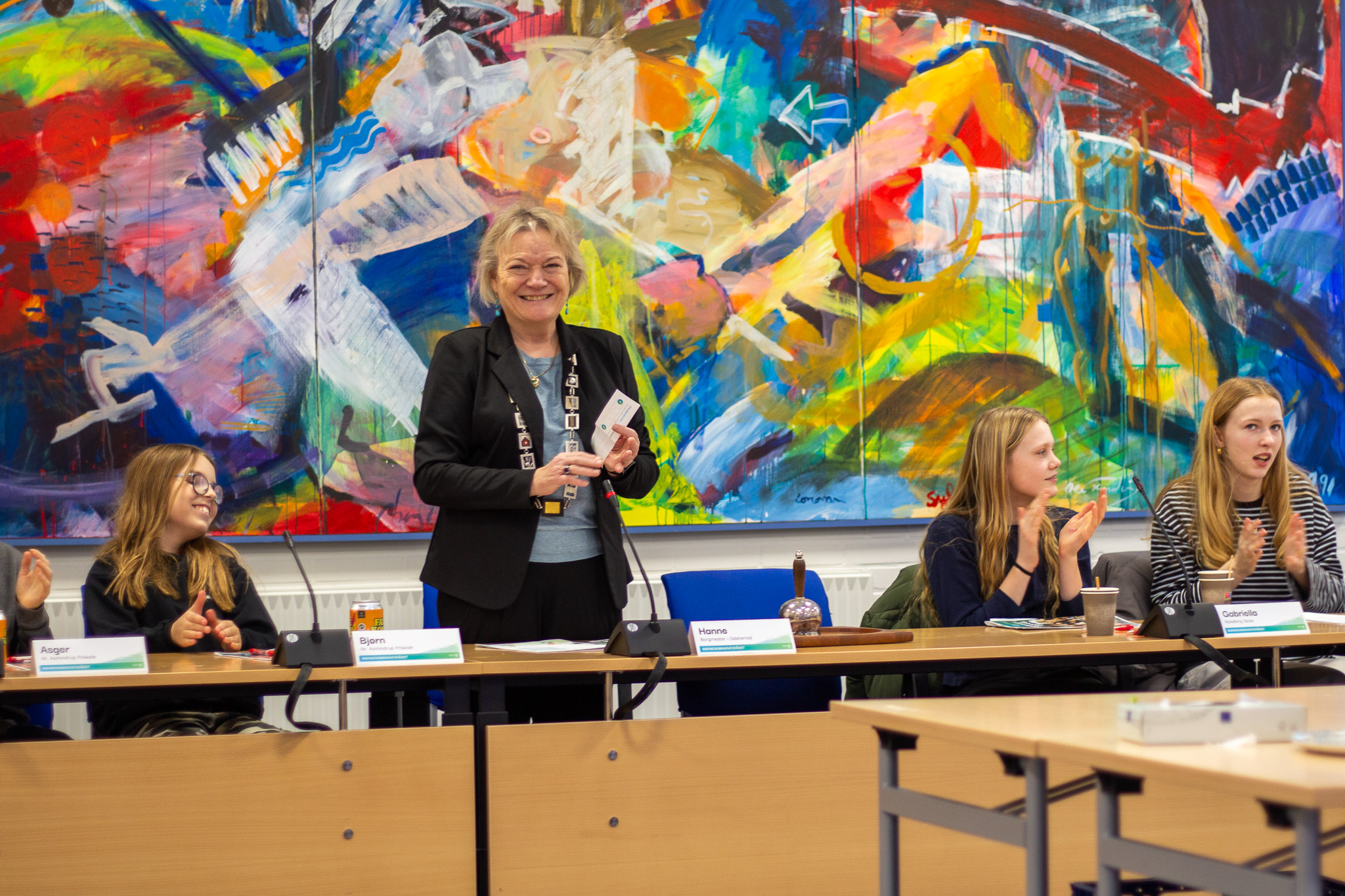 Borgmester Hanne Pigonska var ordstyrer og hjalp eleverne godt gennem dagens demokratiske proces - også med et par staldtips fra borgmesterens egen arbejdsdag.