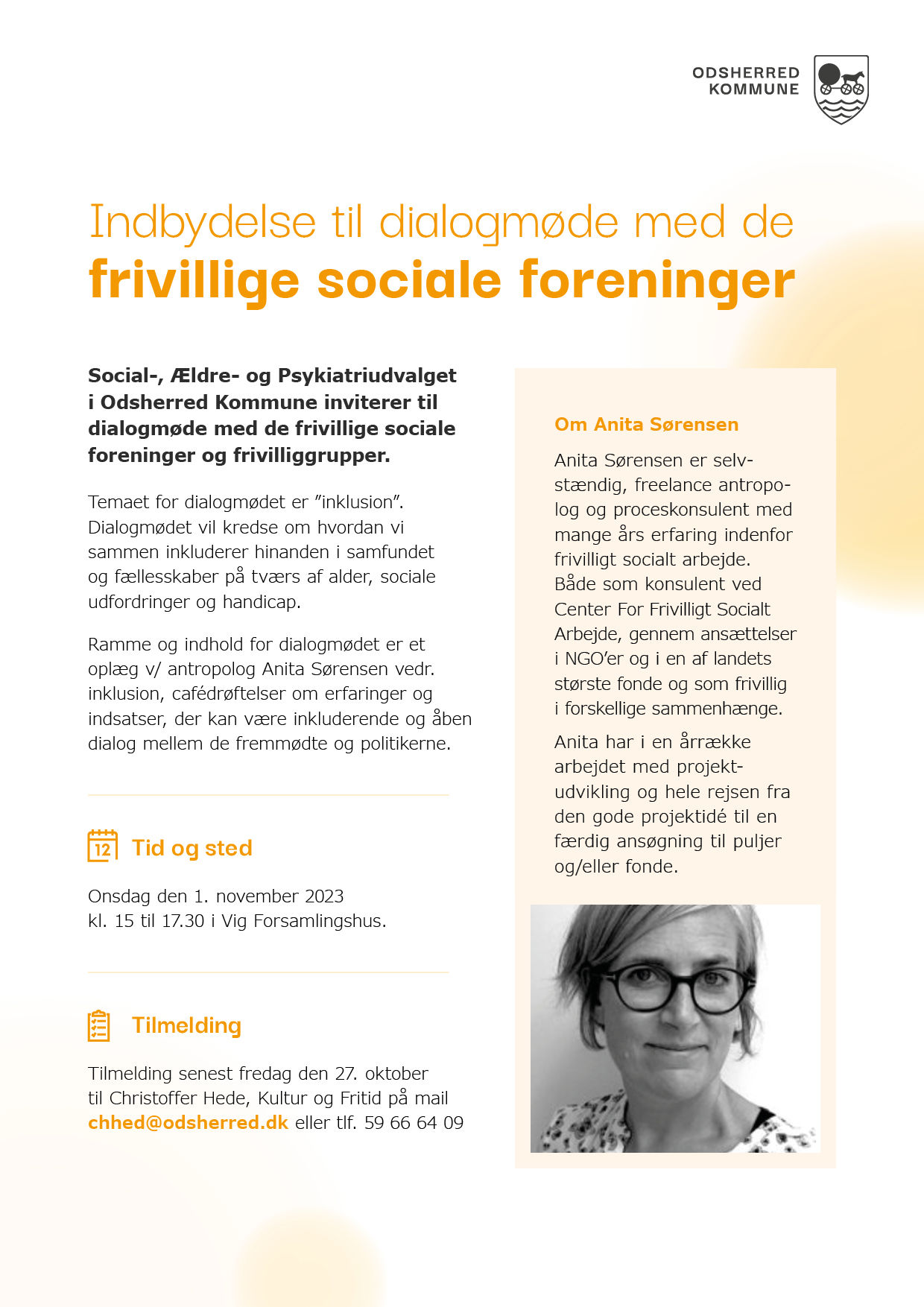 Social-, Ældre- og Psykiatriudvalget i Odsherred Kommune inviterer til dialogmøde i Vig Forsamlingshus onsdag den 1. november 2023 kl. 15.00-17.30 med de frivillige sociale foreninger og frivilliggrupper.