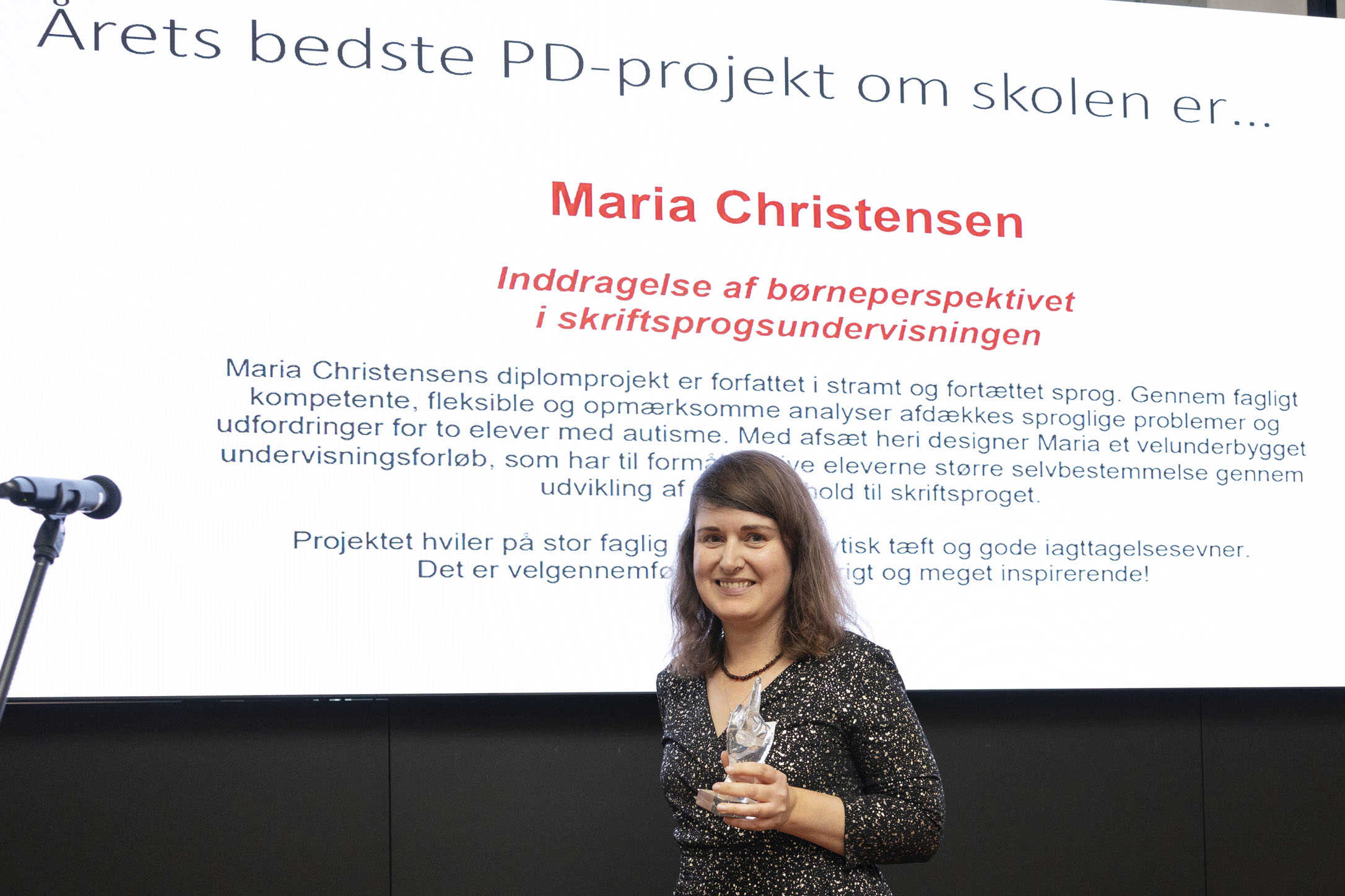 “Maria Christensens diplomprojekt er forfattet i stramt og fortættet sprog. Gennem fagligt kompetente, fleksible og opmærksomme analyser afdækkes sproglige problemer og udfordringer for to elever med autisme. Med afsæt heri designer Maria et velunderbygget undervisningsforløb, som har til formål at give eleverne større selvbestemmelse gennem udvikling af deres forhold til skriftsproget. Projektet hviler på stor faglig indsigt, analytisk tæft og gode iagttagelsesevner. Det er velgennemført, perspektivrigt og meget inspirerende!