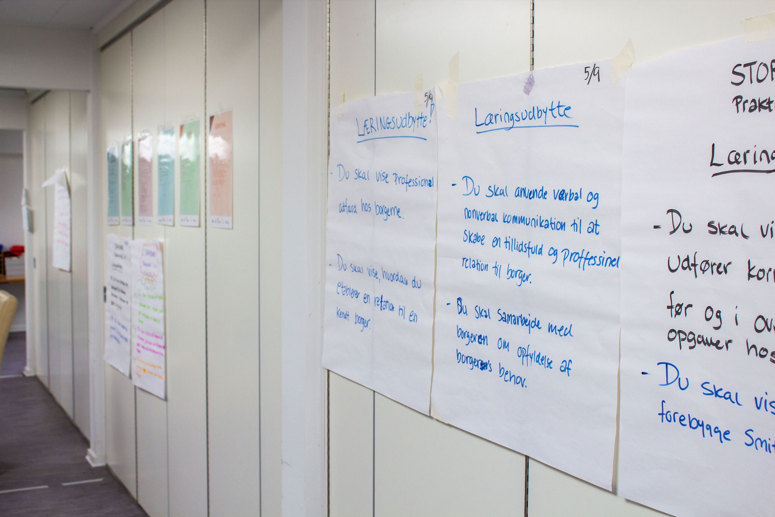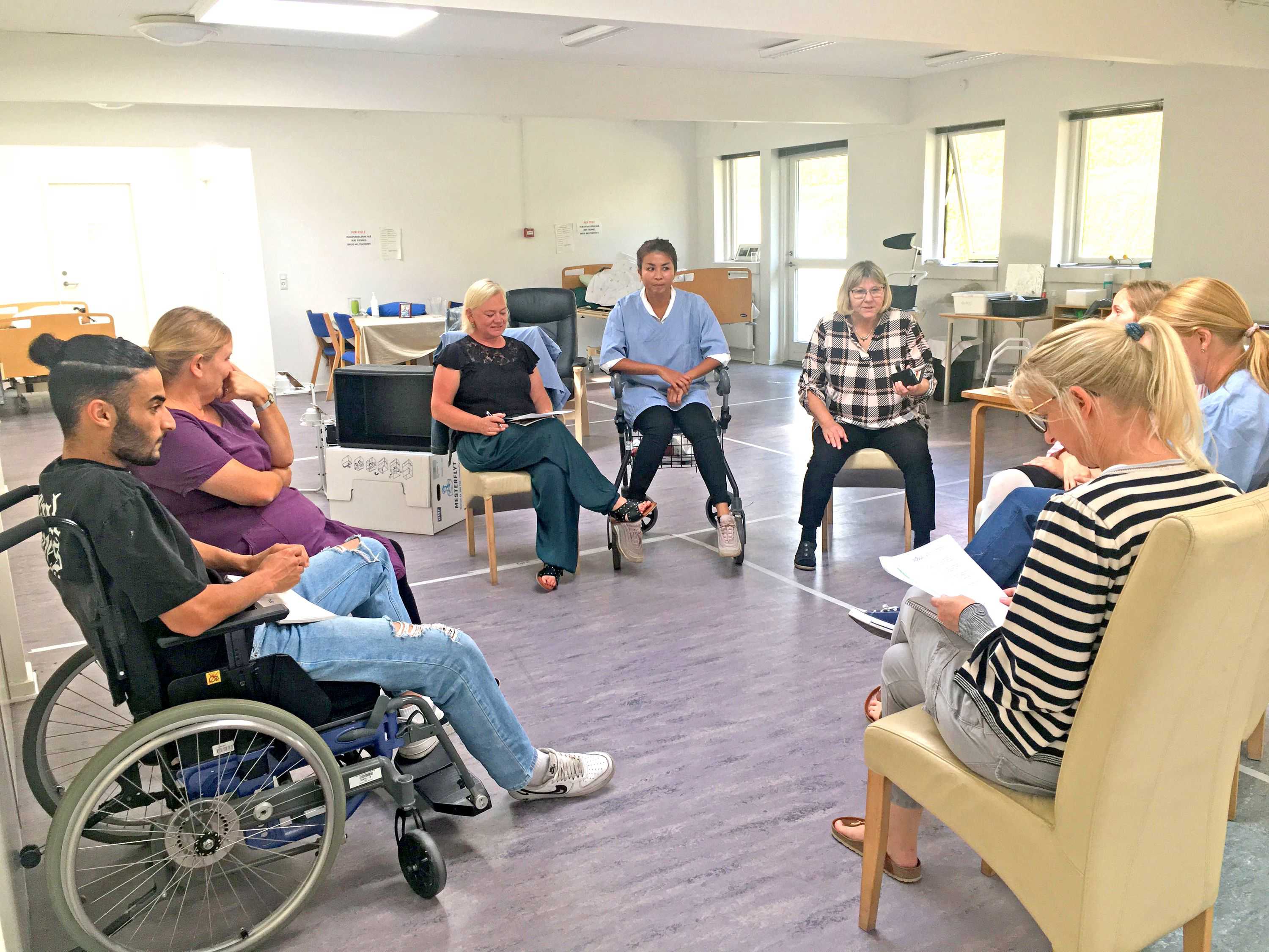 Rummet er Hjemme- og Sygeplejens mødelokaler på Bobjergvej 19 i Asnæs, som i denne anden uge af september 2022 er indrettet som undervisningslokale for at 3 vejledere fra Odsherred kommune, 1 lærer fra SOSU-skolen ZBC i Holbæk og 4 af de syv social- og sundhedsassistentelever, der skal i praktik i Odsherred Kommune, sammen kan arbejde med at øve praktiske færdigheder kombineret med teori.
