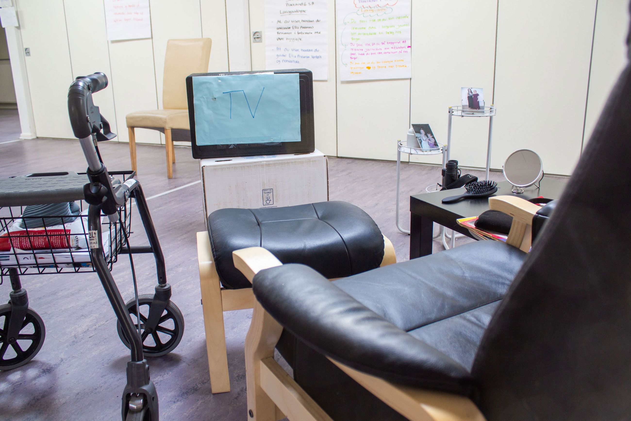 Der ligger en dukke i voksenstørrelse med ble i en plejeseng, der er en sofa, en kasse, der skal ligne et tv og en lænestol og en kørestol, og på gulvet er afmærket rum som soveværelse, stue og badeværelse…