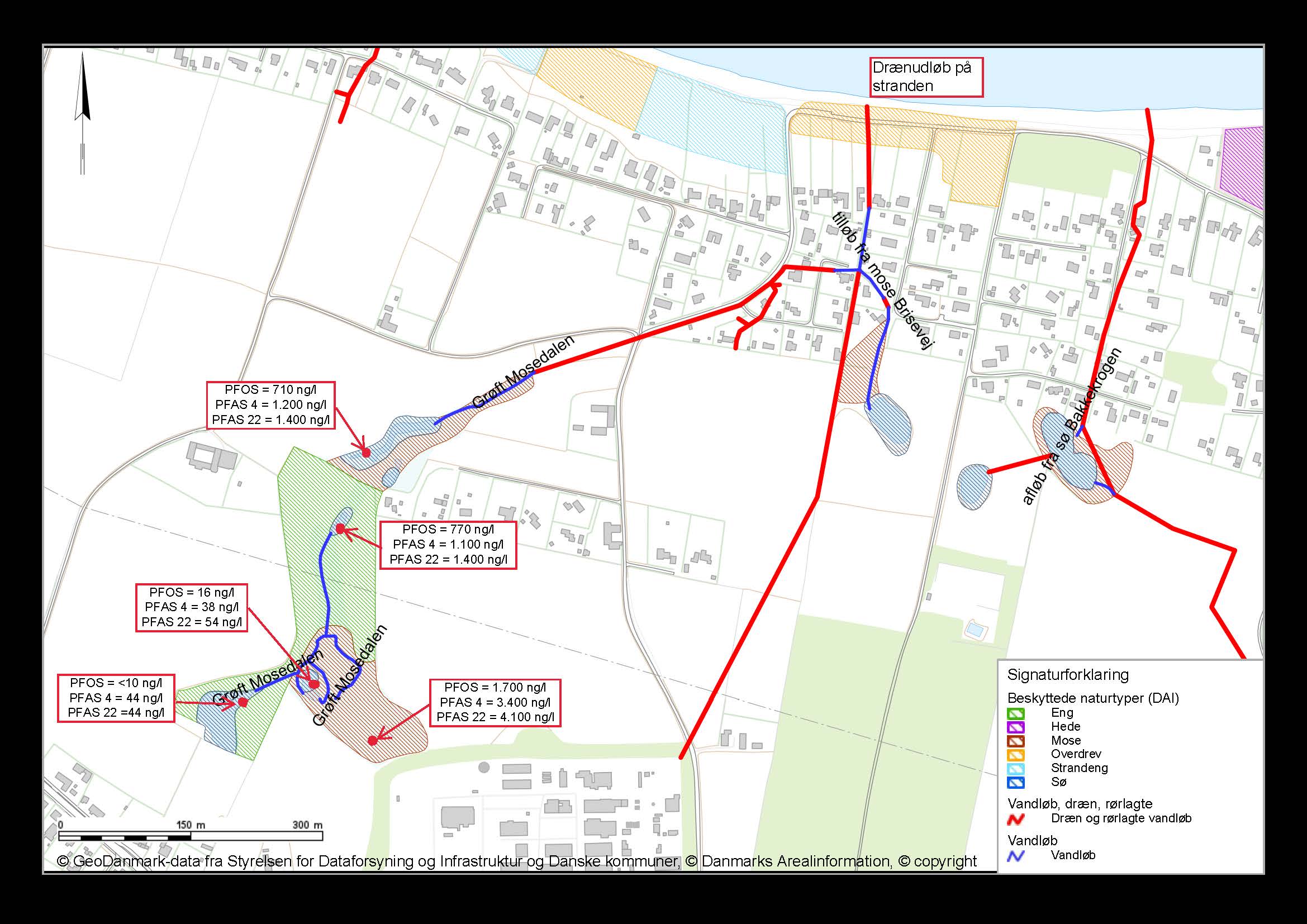 Børn bør ikke indtage jord og vand fra udløbet på stranden, hvor der er konstateret PFAS forurening.